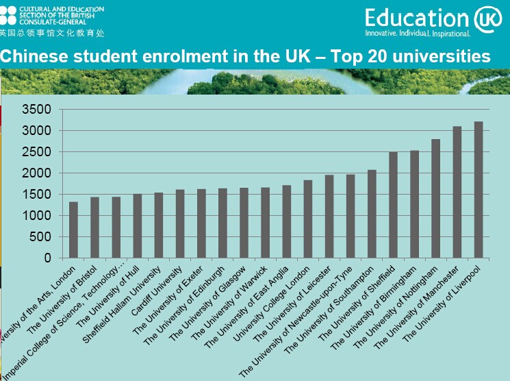 根据权威数据显示,2014年中国学生注册人数最多的前20所英国大学先后是:利物浦大学、曼切斯特大学、诺丁汉大学、伯明翰大学、谢菲尔德大学、南安普顿大学、纽卡斯尔大学、兰卡斯特大学、伦敦大学学院、东英吉利大学、华威大学、格拉斯哥大学、爱丁堡大学、艾克赛特大学、卡迪夫大学、谢菲尔德哈勒姆大学、赫尔大学、帝国理工学院、布里斯托大学、伦敦大学艺术学院。